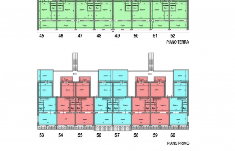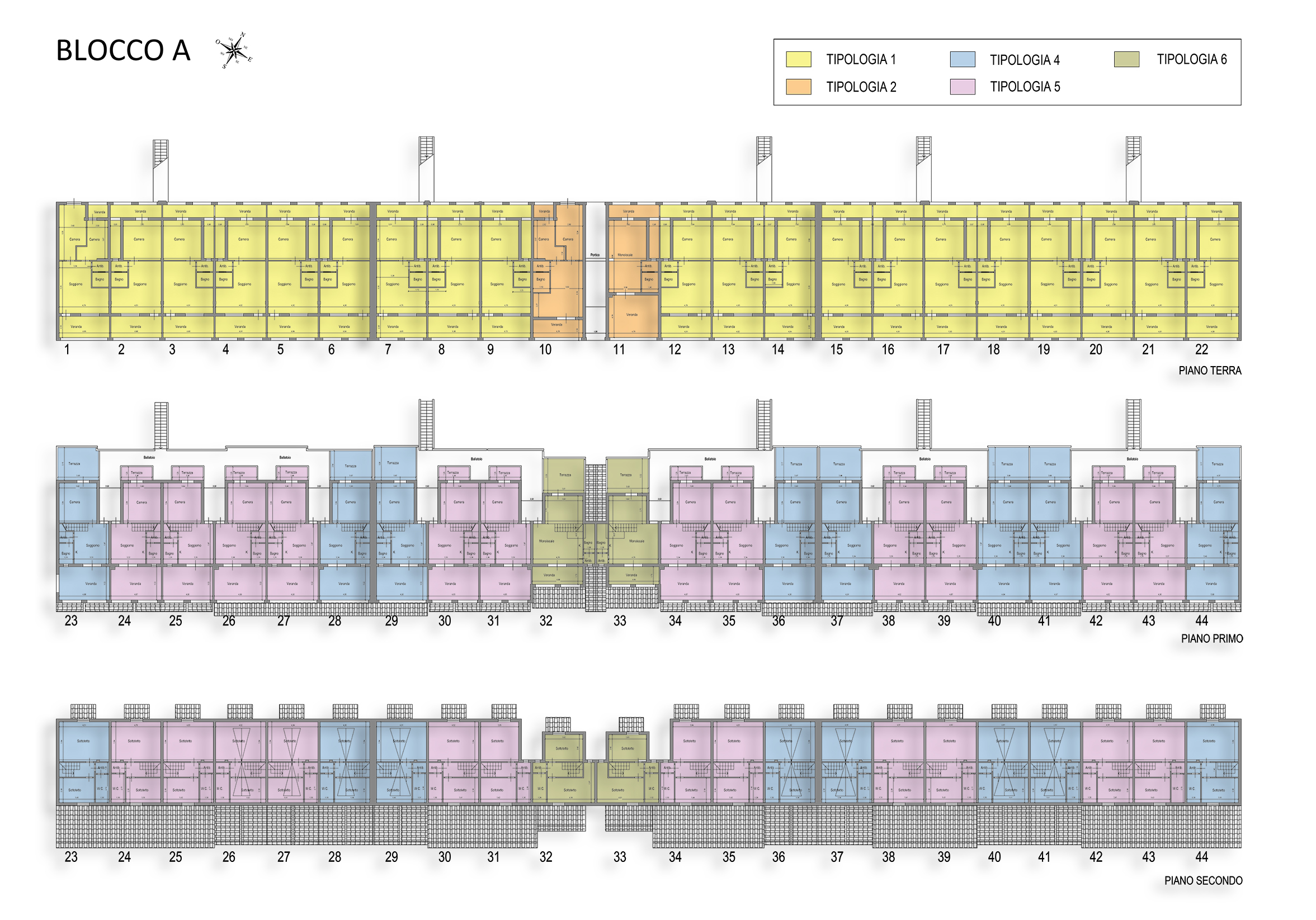 Le tipologie offerte comprendono appartamenti bilocali e trilocali al piano terra dotati di ingresso indipendente, giardino e portico, oltre trilocali e quadrilocali al piano primo con due ampie terrazze, una coperta e l’altra scoperta . Tutti gli appartamenti godono di posti auto privati all’interno della corte protetta condominiale.